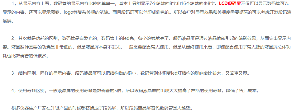 在段码液晶屏出现之前,更广泛应用的显示器件就是数码管屏。随着科技的发展,虽然数码管还在广泛使用,但很多要求高的产品已经逐渐替换成LCD液晶屏。总体来说,比起数码管的屏,段码液晶屏主要有以下优点: